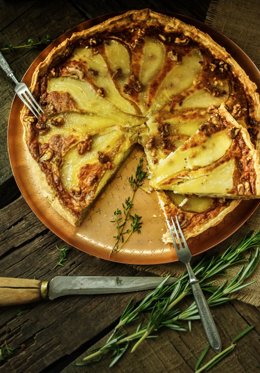 (Quiche) Trapios tešlos pyragas su mėlynojo pelėsio sūriu, kriaušėmis ir karamelizuotais graikiškais riešutais. Pyragai visuomet puošia vaišių stalą, o skonis nepalieka abejingų. Sotu, gardu ir maistinga. Skanaus!